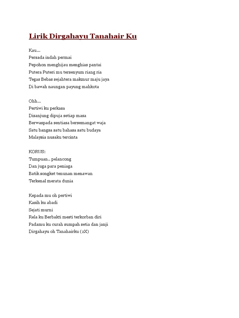 Lagu ini secara khusus digubah guna menumbuhkan kecintaan anak-anak. Lirik Lagu Malaysia Faizal Tahir. Dirgahayu oh tanah airku.